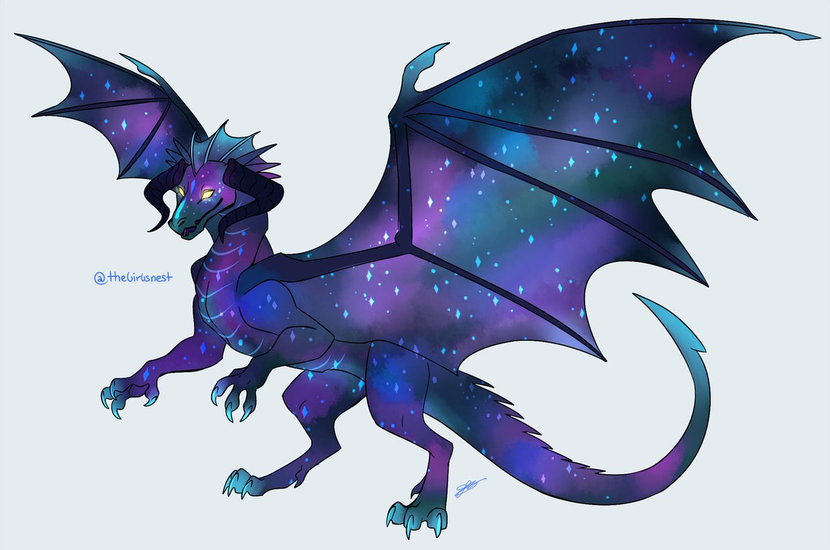 FEATURES In her true form, her scales have a galaxy pattern that shifts and is like looking at space. Overall color is blue, but may change with mood